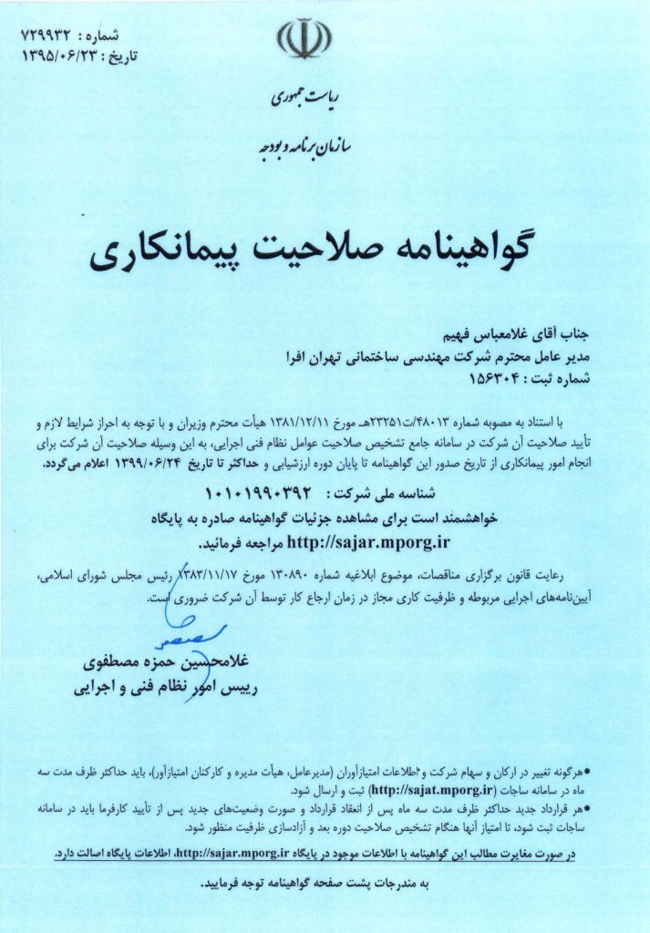 TEHRAN AFRA have recently renewed its construction grade classification under the Presidential Deputy for Strategic Planning and Control (www.spac.ir) department of Iran and have received a “GRADE 1” status for Civil Construction Works, “GRADE 2” status for Utilities Construction Works and “GRADE 5” status for Roads & Runway Construction Works. Tehran Afra has also established a branch oce in Baku City, Azerbaijan Republic and has taken a strategic position in the huge possibilities of the construction developments in the Commonwealth of Independent States (CIS) and its impact in the region.