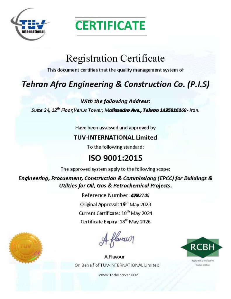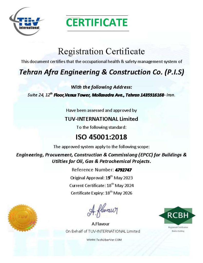 TEHRAN AFRA has been successfully qualified and registered to ISO standards by reputable company TUV International Ltd. for the following certifications: ISO 9001:2015- ISO 14001:2015; and- OHSAS 45001:2018.