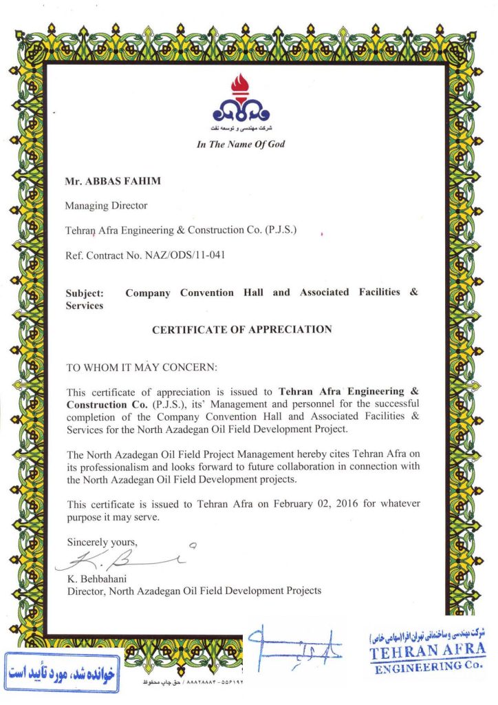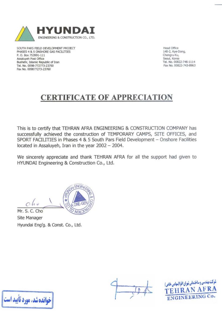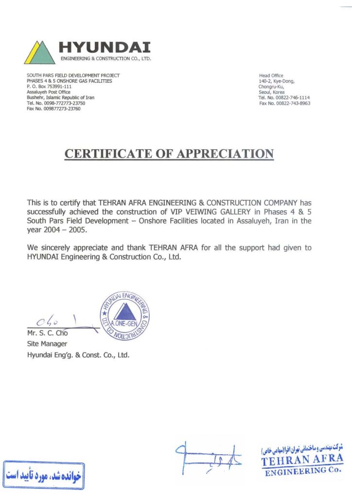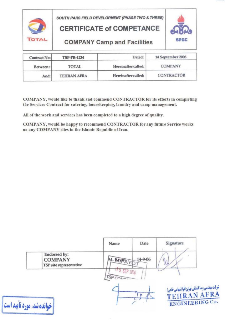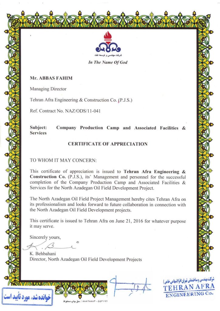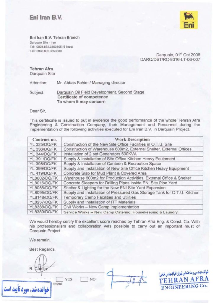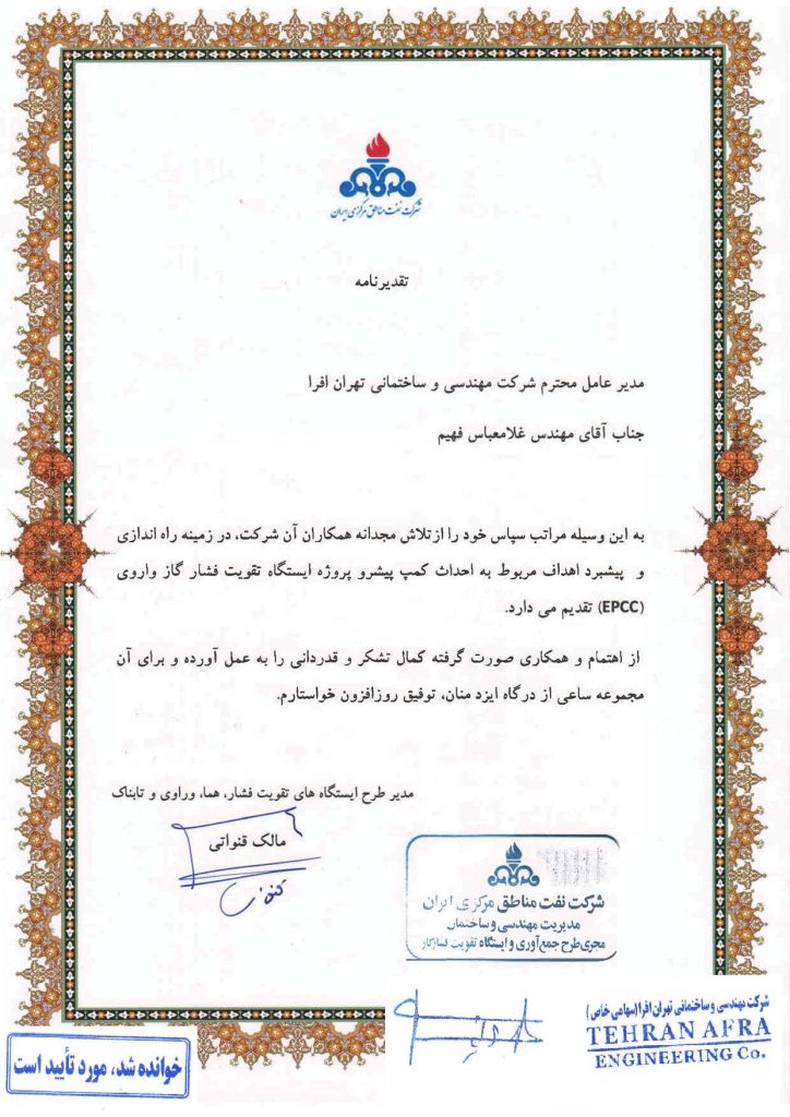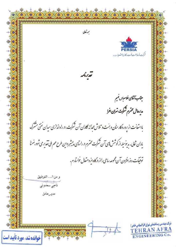 Our clients are our measure of success. While we offer them our available technology and creative ideas to reach to their targeted objectives, they allow us the opportunity to do what we do best and to maximize our potential. TEHRAN AFRA is proud of its association with some of the most prestigious and internationally recognized companies. Thran Afra has done extensive works for a number of clients, both local and international, who has provided certificates of appreciations and satisfaction, some of which are seen below:
