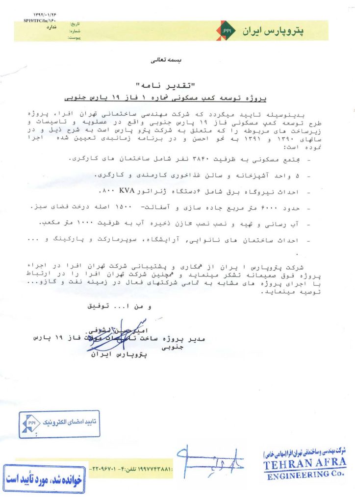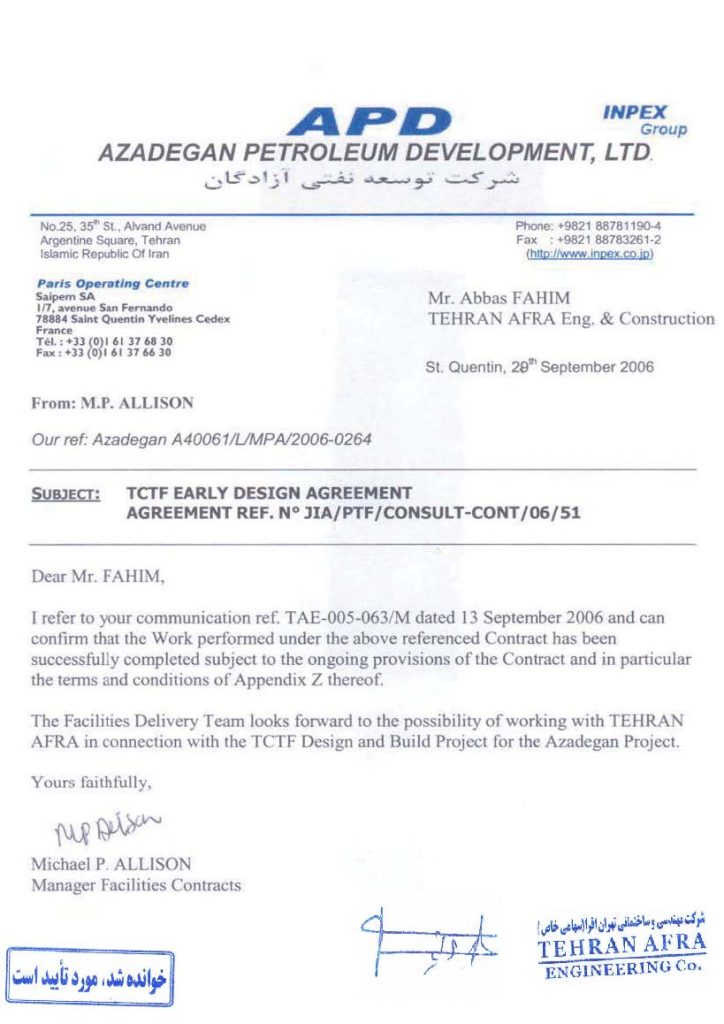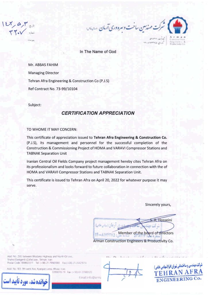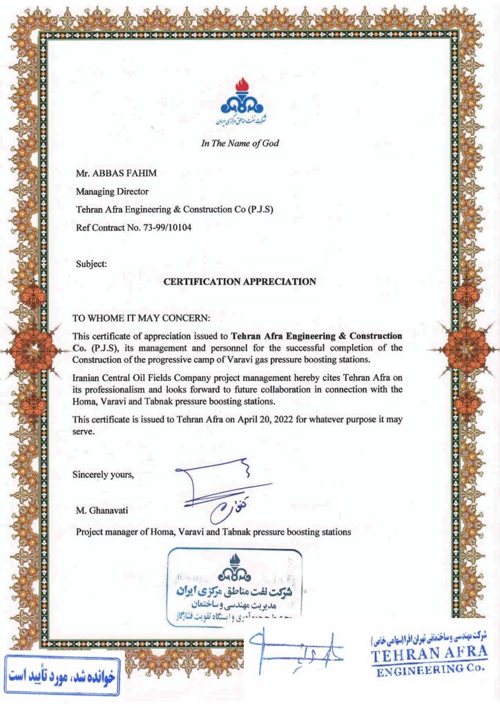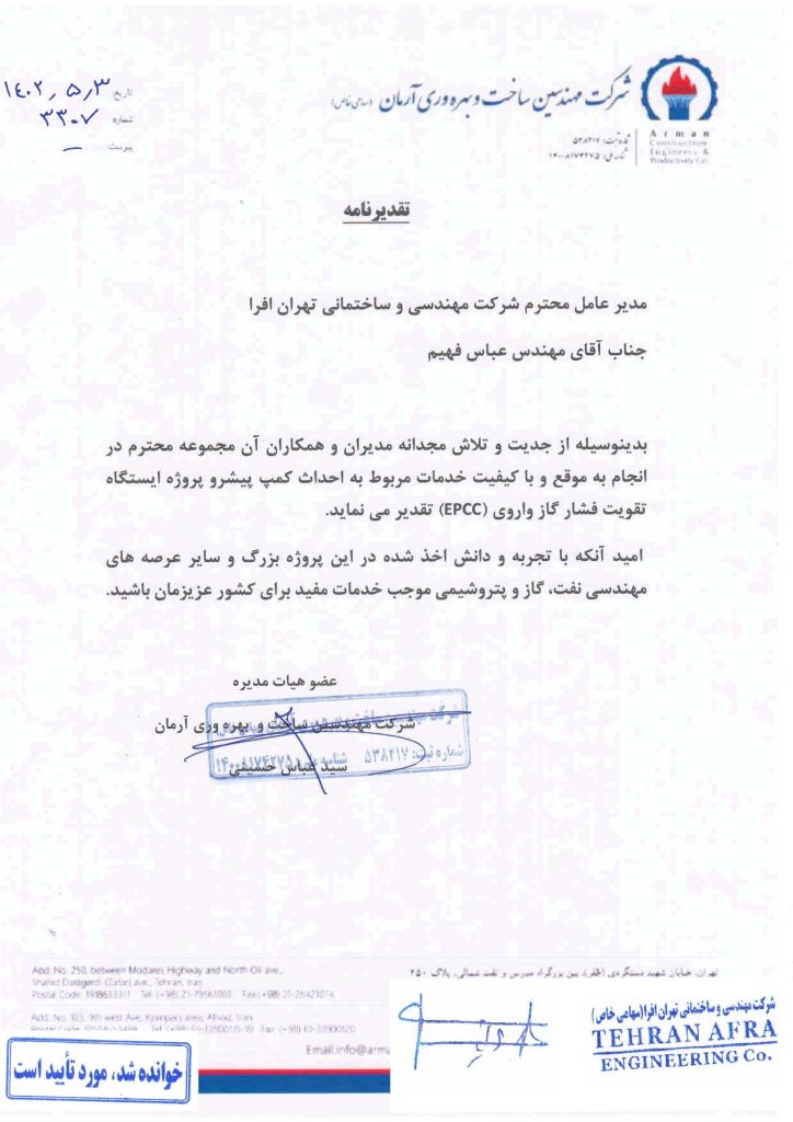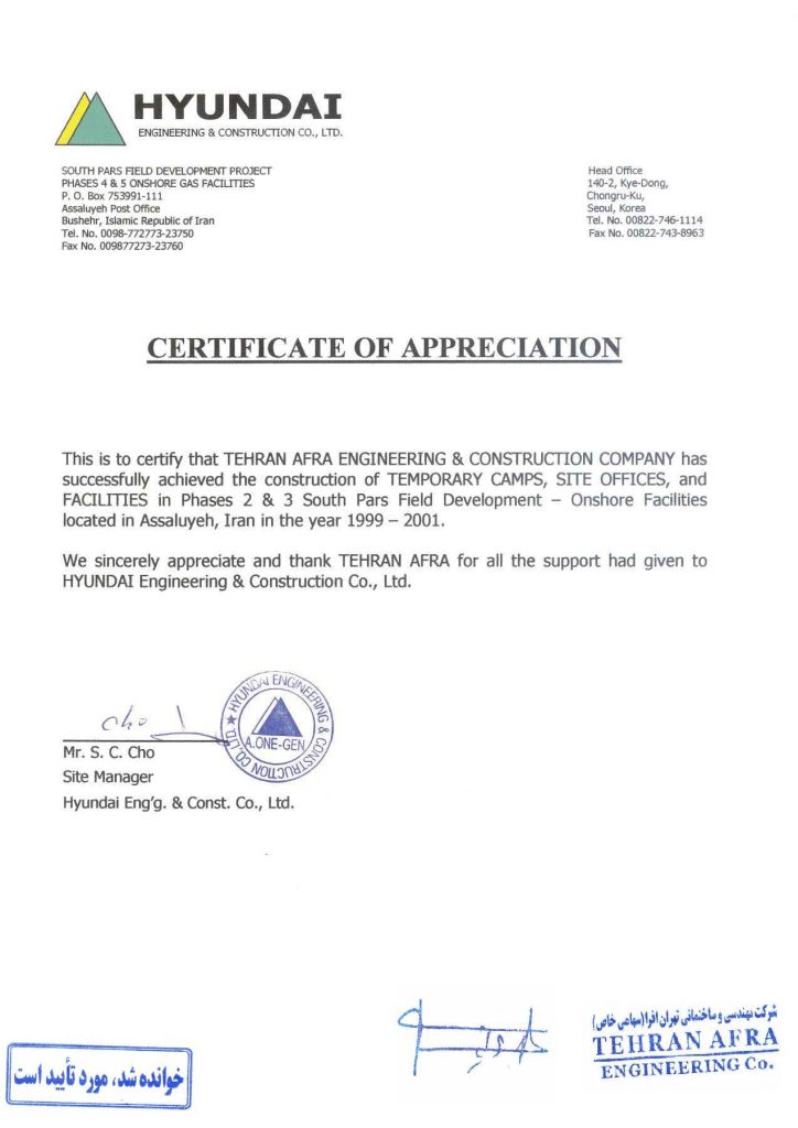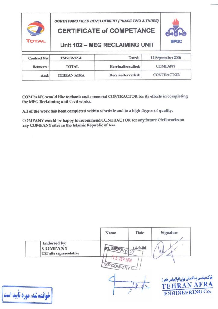 Our clients are our measure of success. While we offer them our available technology and creative ideas to reach to their targeted objectives, they allow us the opportunity to do what we do best and to maximize our potential. TEHRAN AFRA is proud of its association with some of the most prestigious and internationally recognized companies. Thran Afra has done extensive works for a number of clients, both local and international, who has provided certificates of appreciations and satisfaction, some of which are seen below:
